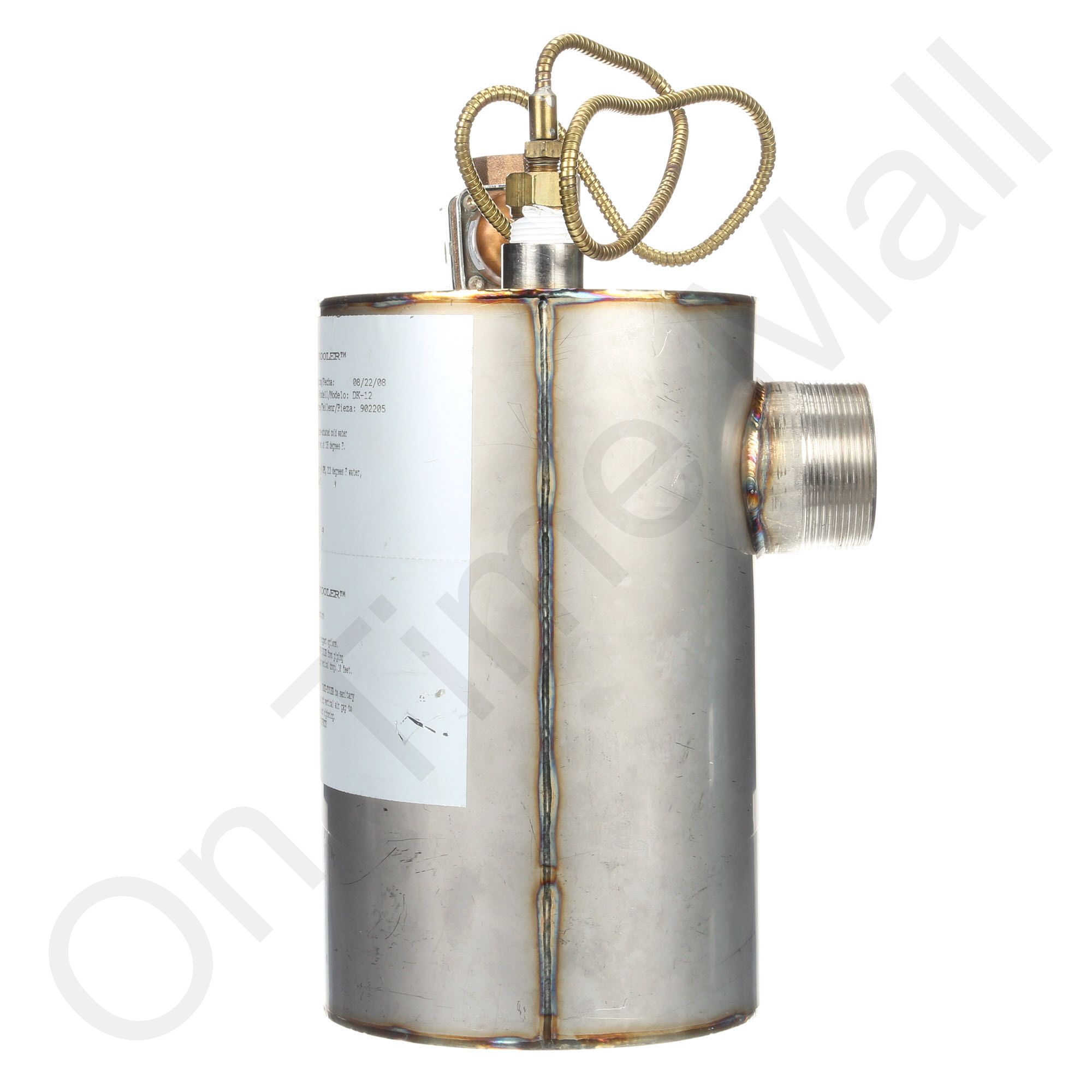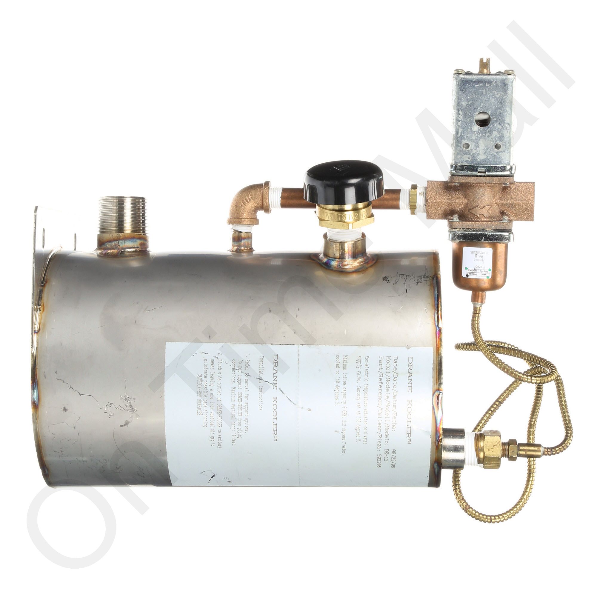 DRANE KOOLER assembly with 12 National Pipe Thread style fittings. This item is made of 316 Stainless Steel. A Drane-kooler is a water tempering device that mixes cold water with hot water discharged from various types of equipment, such as a humidifier, to reduce the discharged water temperature before it enters a municipal sewer system. There are two reasons to use a water tempering device. First, most municipalities prohibit draining water hotter than 140 °F (60 °C) into their sewer systems. And second, PVC drain pipes are susceptible to damage from water that is too hot. The Drane Kooler has a temperature sensor that opens a mechanical valve and mixes fresh water with the hot condensate water when it sees condensate water that is above 140 degrees.